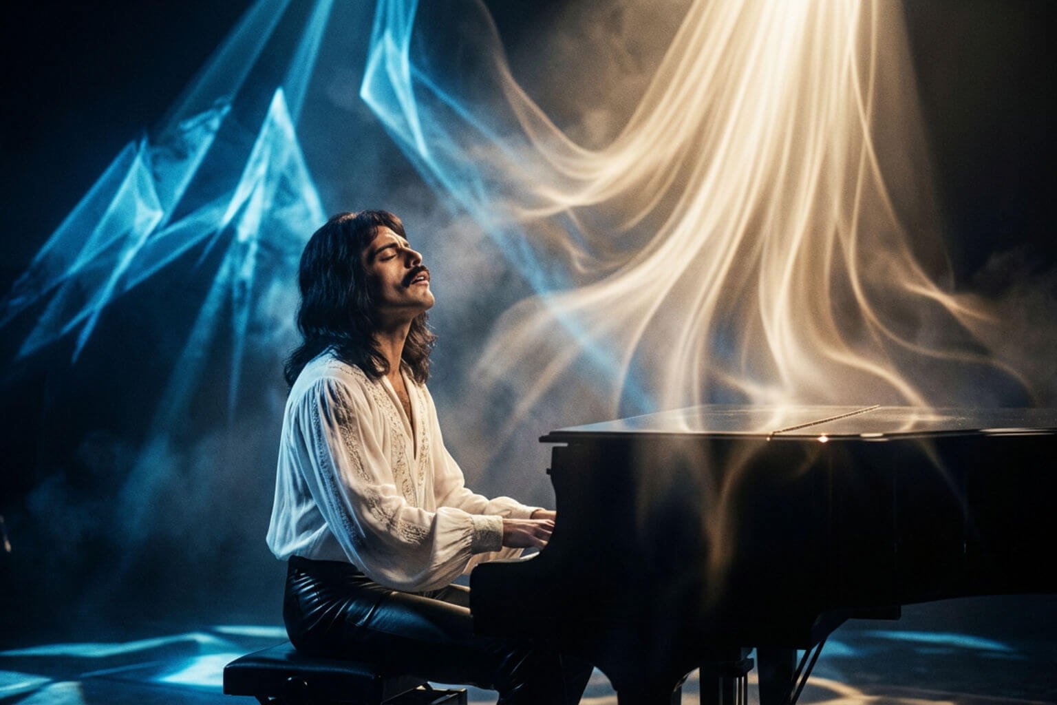 1. Introdução (0:00–0:49): O Portal para o Desconhecido. A música não começa, ela surge do silêncio. Uma complexa harmonia vocal a cappella, sem o apoio de qualquer instrumento, imediatamente quebra as expectativas do ouvinte. As vozes sobrepostas de Mercury, May e Taylor criam uma atmosfera quase celestial, quase um canto gregoriano vindo de outra dimensão. A pergunta “Isso é a vida real? Isso é só fantasia?” não é apenas a letra; é a própria função da música, nos jogando em um estado de sonho e incerteza filosófica antes mesmo de o primeiro acorde de piano ser tocado.
